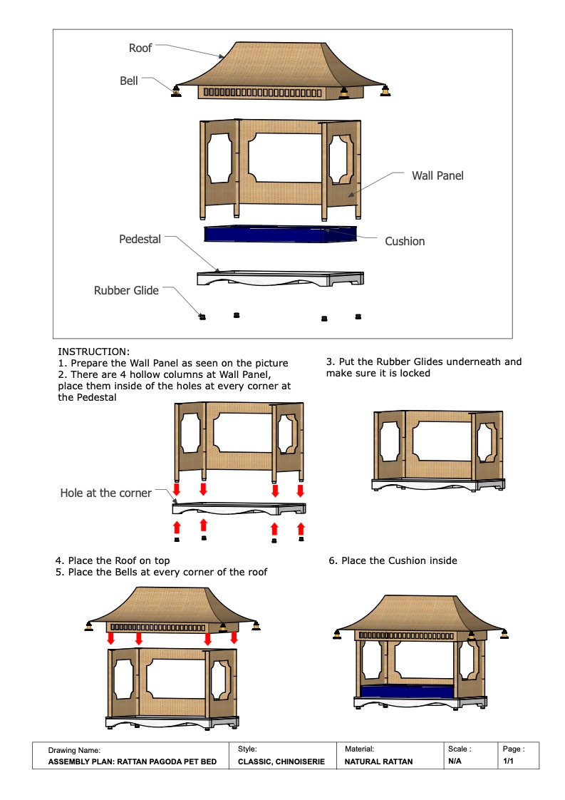 Stylish bed for your lovely furry friend. Built to last, this Pet Bed is constructed of sturdy metal frame with knock down system for less volume packaging, this piece also adds intrigue to a transitional or contemporary room. Featuring pagoda style wicker bed with water-resistant fabric ideals for preventing liquids such as urine or water dripping from a wet dog.